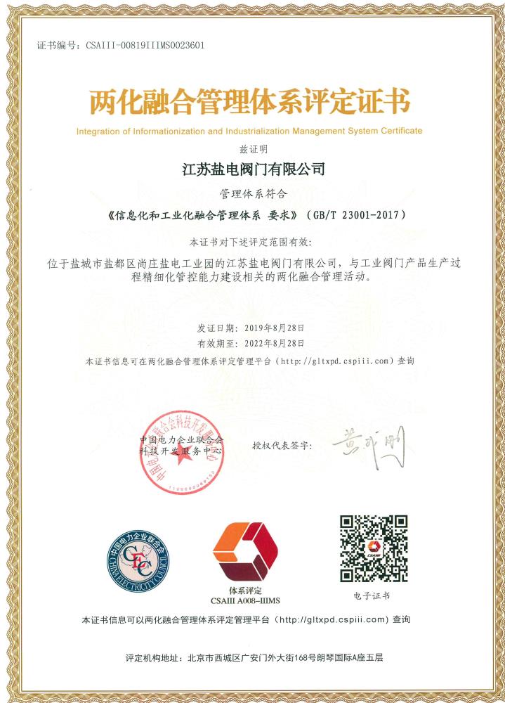 9月23日,中國電力企業(yè)聯(lián)合會科技研發(fā)中心,向江蘇鹽電閥門有限公司頒發(fā)了“國家級兩化融合管理體系評定證書”,證書號為(GB/T 23001-2017),這標志著鹽電閥門在產(chǎn)業(yè)互聯(lián)網(wǎng)上邁上新臺階。 “