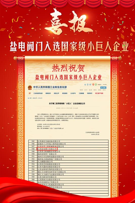 日前,國家工信部公布第二批專精特新“小巨人”企業(yè)名單。江蘇鹽電閥門有限公司以顯著的技術(shù)創(chuàng)新能力和市場競爭優(yōu)勢成功入選。國家級專精特新“小巨人”企業(yè)是“專精特新”中小企業(yè)中的佼佼者,專注于細分市場,創(chuàng)新能力強、市場占有率高,掌握行業(yè)關(guān)鍵核心技術(shù),質(zhì)量效益優(yōu)的排頭兵企業(yè)。