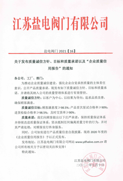 江蘇鹽電閥門有限公司為履行產(chǎn)品質(zhì)量主體責任,提高企業(yè)質(zhì)量誠信意識和質(zhì)量法制意識,推動社會公眾監(jiān)督,特發(fā)布關于發(fā)布質(zhì)量誠信方針、目標和質(zhì)量承諾以及“企業(yè)質(zhì)量信用報告”。