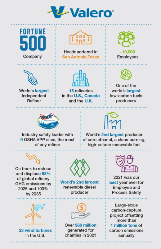 美國瓦萊羅能源公司(Valero Energy Corporation),成立于1980年,是一家獨立的石油煉制和營銷公司,主營三大業(yè)務(wù):煉油、乙醇和零售。該公司在美國、加拿大和英國擁有15家煉油廠。